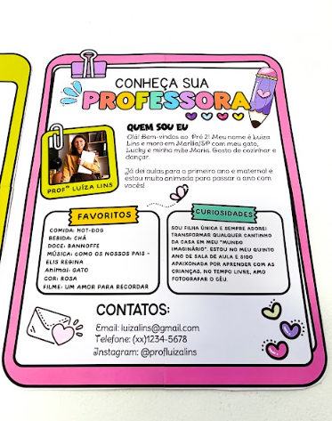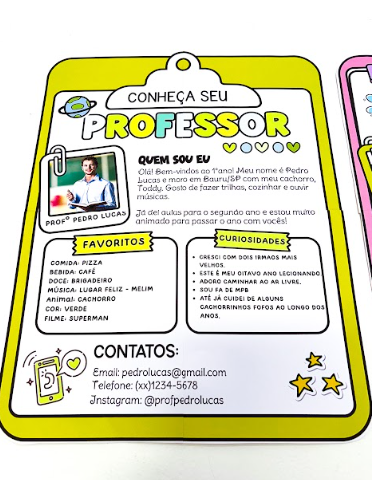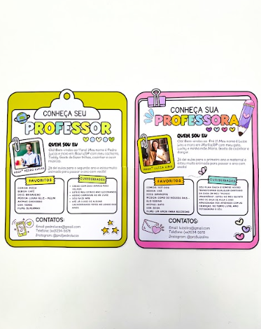 É um cartaz em formato de prancheta, editável, com espaço para foto e texto de apresentação, disponíveis nas versões professor e professora.