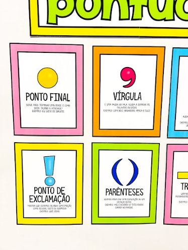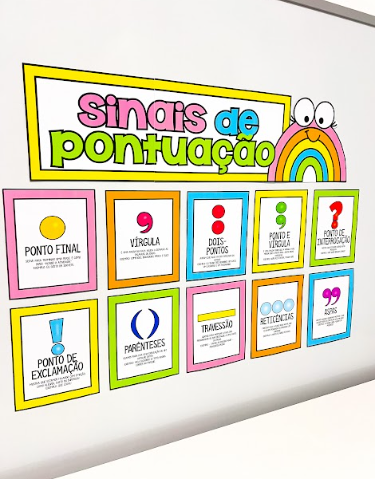 O painel “Sinais de Pontuação” é um material educativo colorido e atrativo, ideal para auxiliar no ensino de gramática e escrita. Ele apresenta, de forma visual e organizada, 10 sinais de pontuação — ponto final, vírgula, dois-pontos, ponto e vírgula, ponto de interrogação, ponto de exclamação, parênteses, travessão, reticências e aspas.