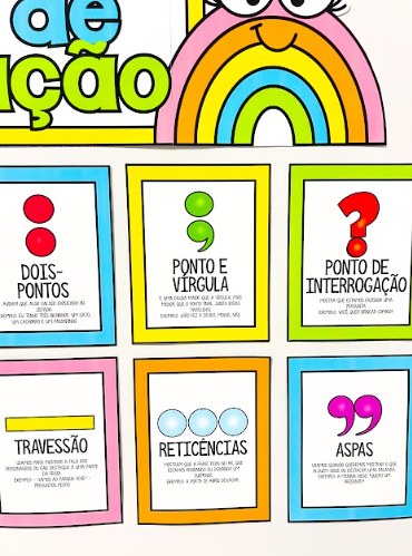 Cada sinal é representado com ilustração, nome e breve explicação sobre seu uso, facilitando a compreensão dos alunos. O design lúdico, com cores vivas e elementos divertidos como arco-íris e expressões simpáticas, estimula o interesse e torna o aprendizado mais dinâmico e prazeroso, sendo ideal